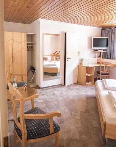 Die Zimmer, im rustikalen Landhausstil mit ca. 16 qm, befinden sich auf der 2. Etage.