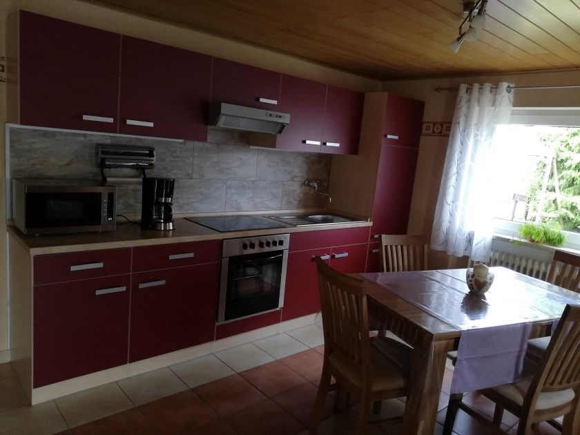 Sehr ruhige Lage am Ortsrand, 55 qm groß, Parterre, separater Eingang, Zentralheizung, komplett eingerichteter Küche-Wohnraum mit Cerankochfeld und Elektroherd, Kühlschrank, Mikrowelle, Spüle, Geschirrspüler, Toaster, Kaffeemaschine, Tassimo, Wasserkocher, Eierkocher sowie Koch- und Essgeschirr.