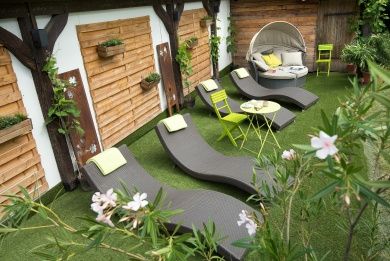- Sonnenterrasse mit Liegewiese und urigen großen Holzfässern zum verweilen