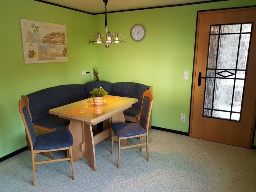 • Komplett eingerichtete Küche mit Essecke (Mikrowelle, Geschirrspüler, Gefrierschrank)