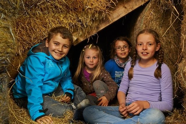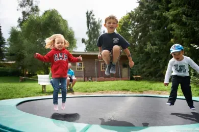 - Große Spiel- und Liegewiese mit Schaukeln, Rutsche, Hüpfburg, Tischtennis, Sandkasten, Kletterbaum, künstlichem Bachlauf, Trettraktoren, Bobbycars, Kettcars und 4,3 m Trampolin