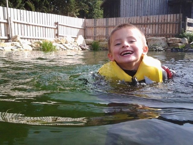 Zur Abkühlung in den heißen Sommermonaten lädt der neue Naturschwimmteich ein, Badevergnügen direkt auf dem Bauernhof, zu jeder Zeit eine Abkühlung parat, das pure Kindervergnügen, die ideale Erholung nach tollen Ausflügen. Der Schwimmbereich ist 5 m x 12 m und 1,30 m tief das Kinderbecken 3 m x 3 m und ist 27 cm tief. Damit Sie sich auch auf Ihrer Terrasse entspannt zurücklegen können, sind der Schwimmteich und unser Seerosenteich Kindersicher 1,5 m hoch eingezäunt.