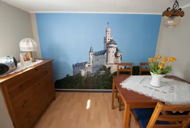 - Wohnzimmer: Das Wohnzimmer ist mit einem Fernseher mit Kalbelanschluss ausgestattet. Dazu finden sie stets eine aktuelle Fernsehzeitschrift vor. Ein DVD-Player ist ebenfalls vorhanden. Eine gemütliche Sofaecke lädt zum Entspannen ein. Um dabei Musik zu hören, steht Ihnen eine Kompaktanlage mit Radio, Kassetten- und CD-Spieler zur Verfügung. Des Weiteren steht eine Auswahl an Büchern für Lesefreunde bereit. Für gesellige Abende sind zudem diverse Gesellschaftsspiele vorhanden.