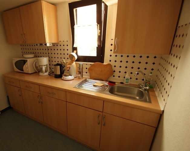 - Küche: Die Küche ist ausgestattet mit einem Herd mit Ceranfeld und einem Umluft-Backofen, einer Spülmaschine, sowie einem Kühl- und einem Tiefkühlschrank. Neben einer Mikrowelle verfügt sie zudem über eine Kaffeemaschine, Senseo-Maschine, Wasserkocher, Toaster und eine Brotschneidemaschine. Außerdem finden sich in der Küche natürlich Töpfe und Pfannen, Geschirrhandtücher, verschiedene Kochbücher sowie Geschirr für bis zu sechs Personen.