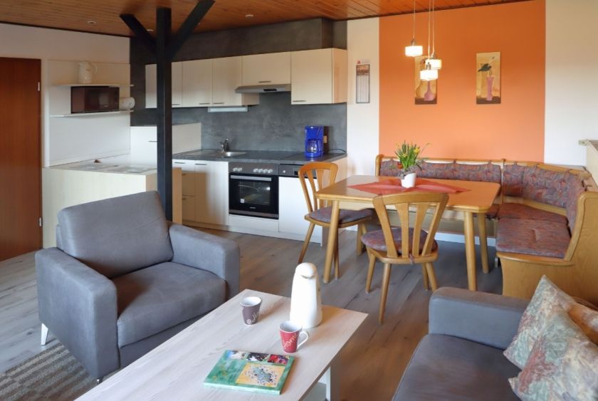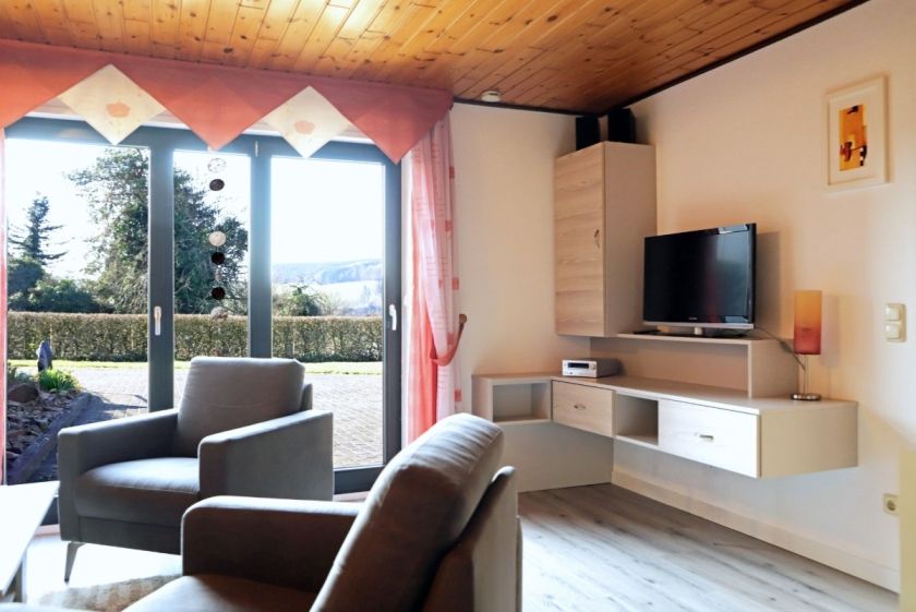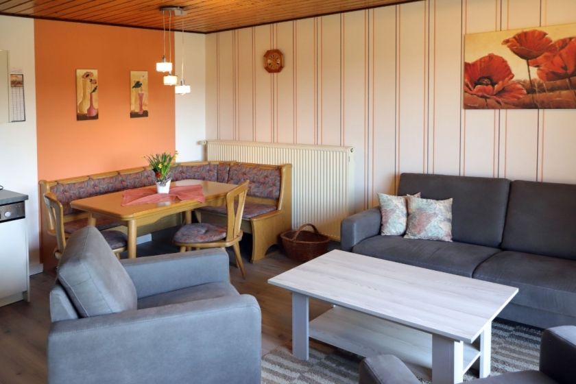 - Großzügiges Wohnzimmer mit TV, Sitzecke und Einbauküche