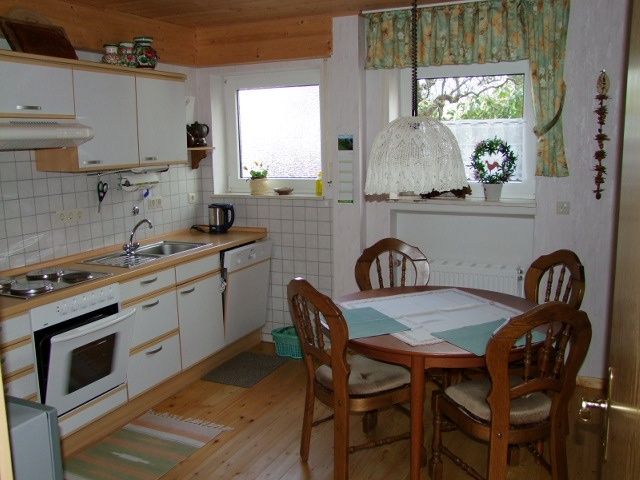 Die für 2 - 4 Personen nutzbare, ebenerdig erreichbare FeWo hat eine separate Küche mit Esstisch und gut eingerichteter Küchenzeile mit Geschirrspüler, Mikrowelle, Kühl-Gefrierkombination, Kaffee-, Espressomaschine sowie Toaster, Wasserkocher, Eierkocher und Geschirr.