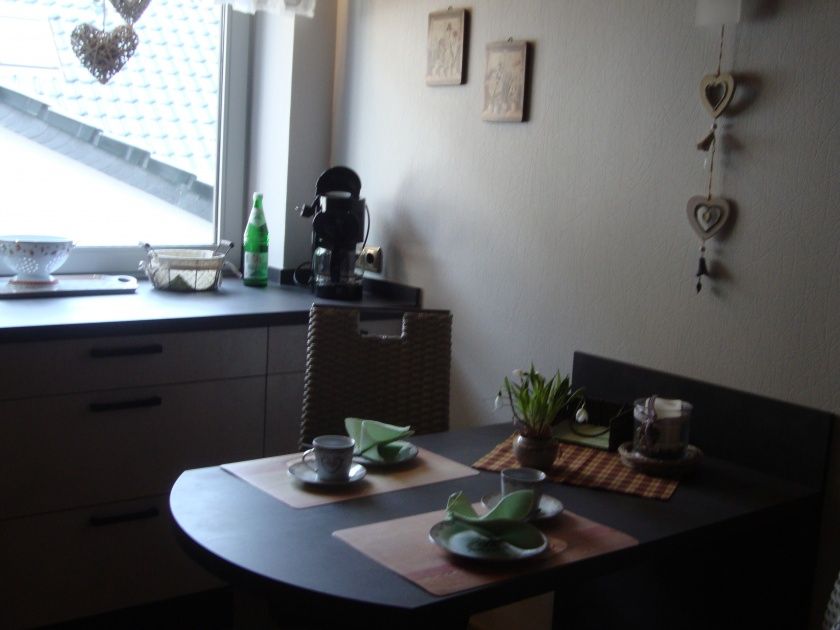 • Ceran-Kochfeld, Geschirrhandtücher, Kaffeemaschine, Küchenzeile, Kühlschrank, Mikrowelle, Toaster, Wasserkocher