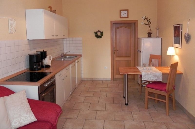 - Wohnraum mit Sofa, großer LED -TV, Radio, Essplatz und komplett eingerichtete Küchenzeile mit Herd (Cerankochfeld), Backofen, Geschirrspüler, Kühl-/Gefrierkombination, Kaffeemaschine und Senseomaschine, Mikrowelle und Toaster,Wasserkocher. Geschirrtücher u. Spültücher ,Spüli ,Filtertüten,