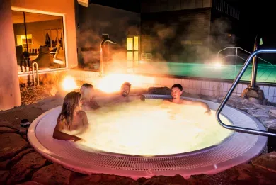 - Zum Abkühlen können Sie sich am Eisbrunnen erfrischen oder im Outdoor-Pool schwimmen gehen. Zum Entspannen ist der mollig warme Whirlpool ideal.