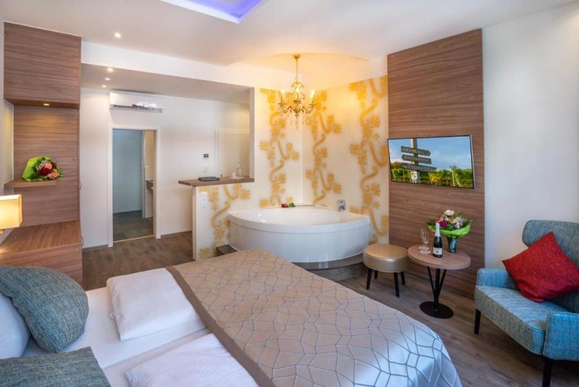 • Das Highlight dieses Doppelzimmer ist das Badezimmer: Badewanne mit Aussicht, Regendusche, Infrarot-Sauna, großes Waschbecken, WC. Das Spa Doppelzimmer befindet sich in der dritten Etage und hat einen tollen Blick zu den Weinbergen und Wehrtürmen der Stadt.