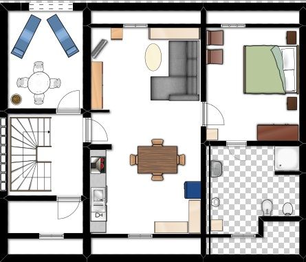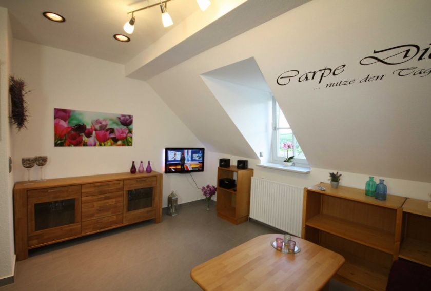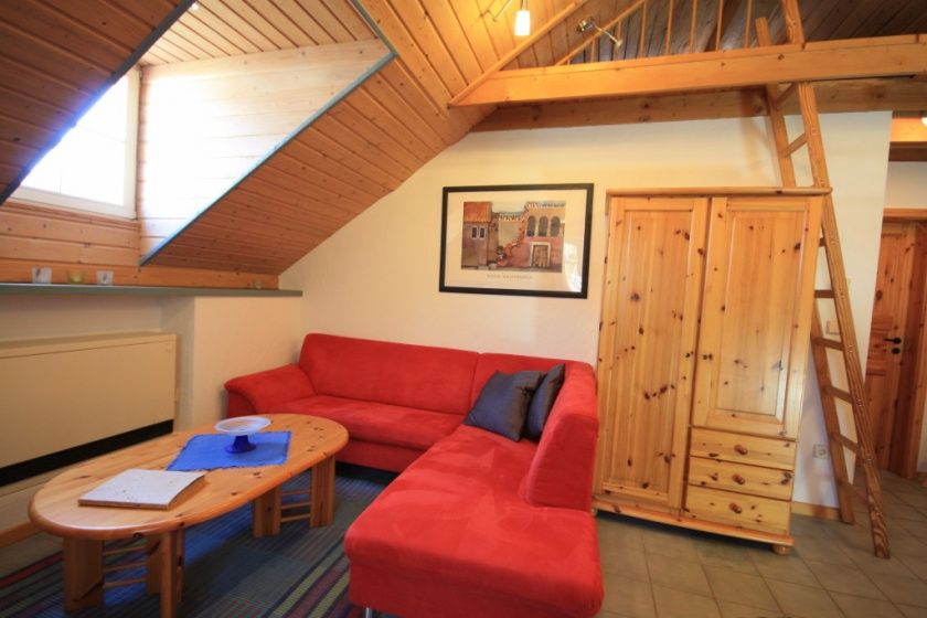Die 45 qm große Ferienwohnung Alte Schmiede ist liebevoll eingerichtet. Ein Wohn-Essraum mit Küchenzeile, Sofa, Spitzboden für kleine Kinder, 1 Schlafzimmer und Du/WC bieten Platz für 2 Erwachsene + Kinder.
