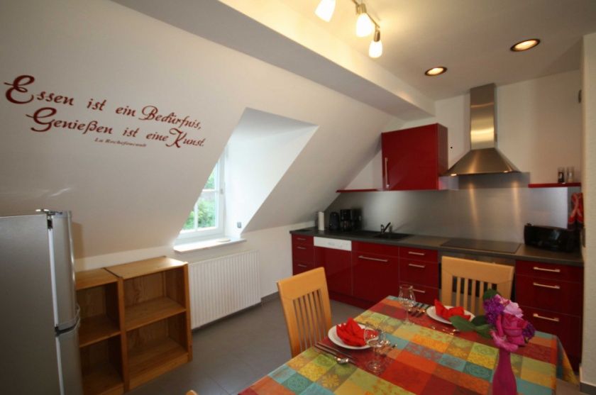 45 qm große Nichtraucher-Ferienwohnung komplett eingerichtet für 2 Personen. Wohnraum mit SAT-TV, Essraum mit komplett eingerichteter Küche, 1 Schlafzimmer mit Doppelbett 180 x 200 cm und Kinderbett 60 x 120 cm, Dusche/WC, Dachbalkon mit weitem Blick auf Mosel und Weinberge.