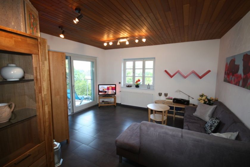 65 qm große Wohnung liebevoll und komplett eingerichtet für 2 Personen. Wohnraum mit SAT-TV,  Essraum mit komplett eingerichteter Küche, 1 Schlafzimmer mit Doppelbett 180 x 200 cm und Kinderbett 60 x 120 cm, große Dusche/WC Loggia mit herrlichem Blick ins Moseltal.