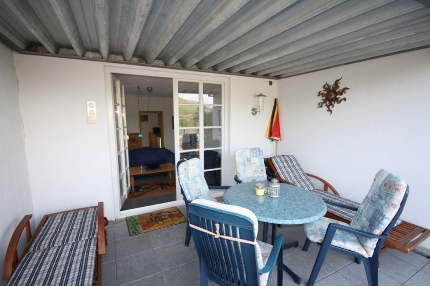 Über die teilüberdachte Terrasse erreichen Sie die Ferienwohnung. Auf 13 qm mit Basaltplatten belegter Fläche stehen für Sie Tisch, Bank, Stühle und Grill bereit. Genießen Sie einen lauen Sommerabend bei einem Glas Moselwein auf der Terrasse.