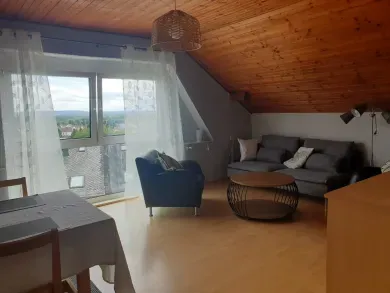 Die gemütliche, kinderfreundliche 75 qm Wohnung liegt in einer ruhigen Nebenstraße am Ortsrand, etwa 700 m vom Ohmbachsee entfernt. Sie verteilt sich über ein Wohn-Ess-Zimmer mit herrlichem Panoramablick, zwei Doppelzimmer, Küche und Bad.