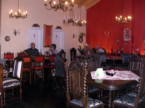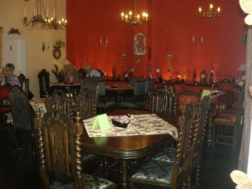 Die antiken Möbel für die Probierstube wurden über mehrere Jahre aus ganz Deutschland zusammengetragen. Über den Möbeln und den daran sitzenden Gästen "thronen" Lüster und Kronleuchter.