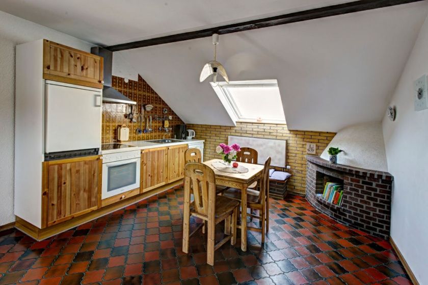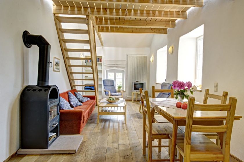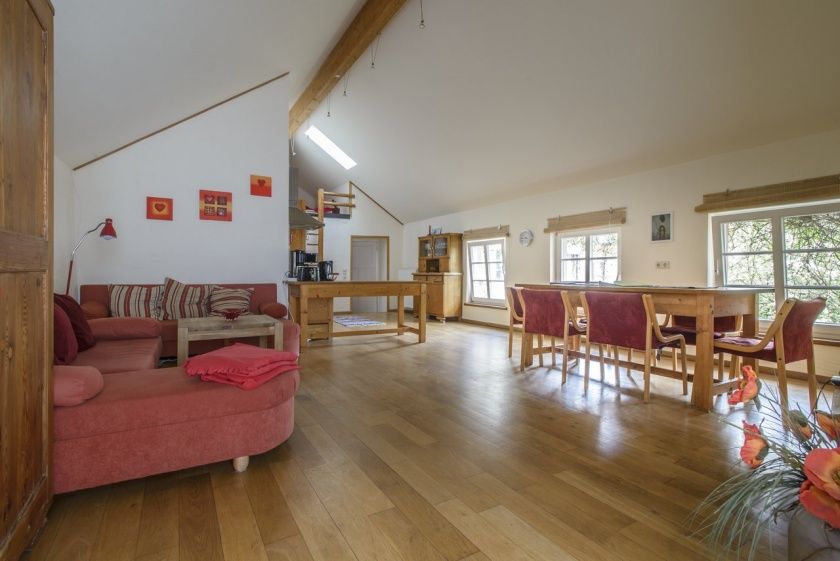 - Ferienwohnung Mohnblume, bis zu 6 Personen, bis zum Dach offenes Koch-, Ess- und Wohnzimmer mit voll ausgestatteter Küche, Schlafgalerie, Bad mit Badewanne/WC, Terrasse, separater Eingang, 4-Bett Schlafzimmer und Schlafgalerie mit 2 Schlafplätzen.