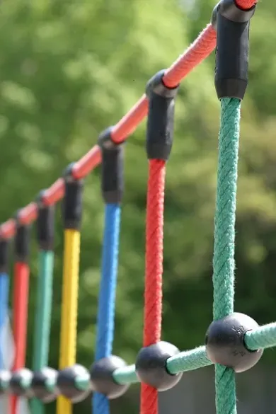 Besteht aus folgenden Elementen: Laufplatten, Steigbügel, Schlaufen, Wechselbretter und Drahtseilgänge