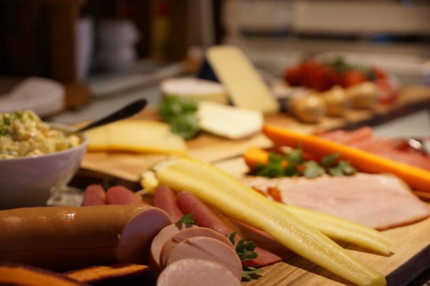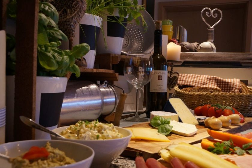 Eine leckere Auswahl an Wurst, Käse, Müsli, selbstgemachter Marmelade und frischen Brötchen – Weizen, Dinkel, Roggen, Körner - sowie das obligatorische Frühstücksei.