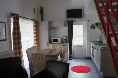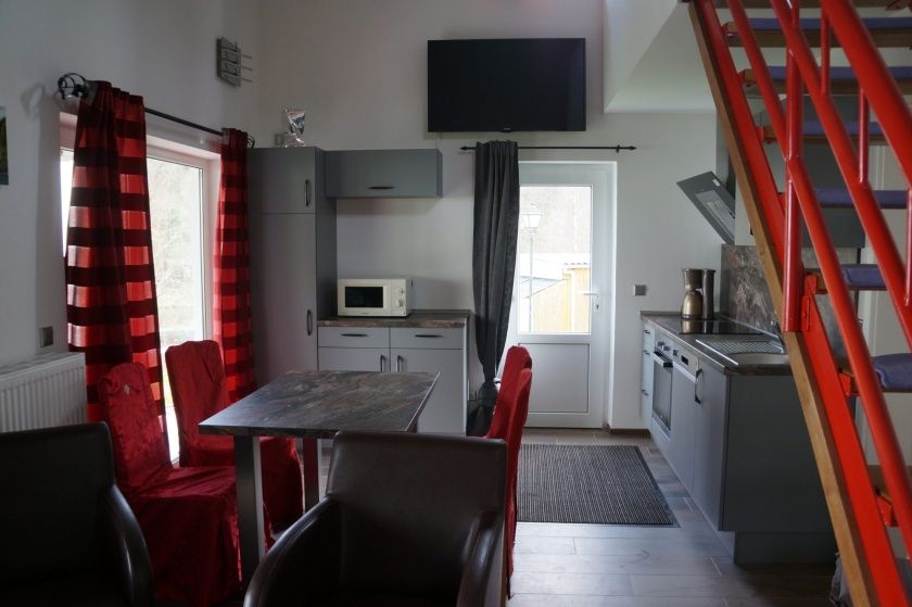 - Wohn- und Essraum mit komplett eingerichteter Küche: Geschirr, Töpfe, Mikrowelle, Backofen, großer Kühlschrank, Spülmaschine (Ferienhaus 1,2)