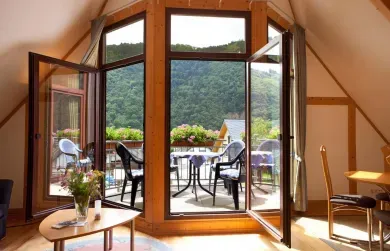 Genießen Sie in der "Ferienwohnung „Mosel“ die wunderbare Aussicht auf das Moseltal. Für bis zu 3 Personen.