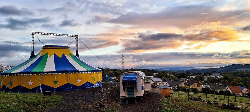 - Zweimast-Zirkuszelt auf der Feriendorfwiese mit urigem Zirkuswagen