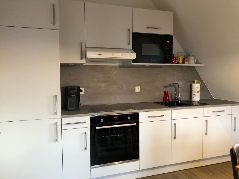 - Komplett ausgestattete Küche mit Kühlschrank, Kaffeemaschine, Toaster, Herd, Wasserkocher und Mikrowelle
