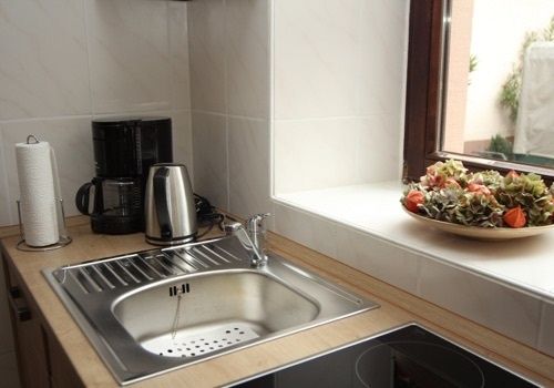 - Küche, inkl. Geschirr, Kühlschrank, Spülmaschine, Kaffeemaschine, Mikrowelle, Wasserkocher, Eierkocher, Geschirrhandtücher