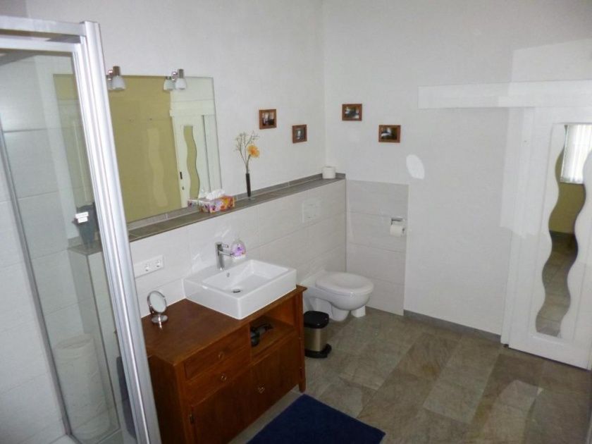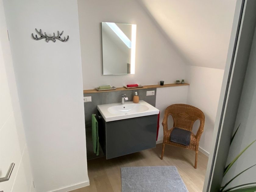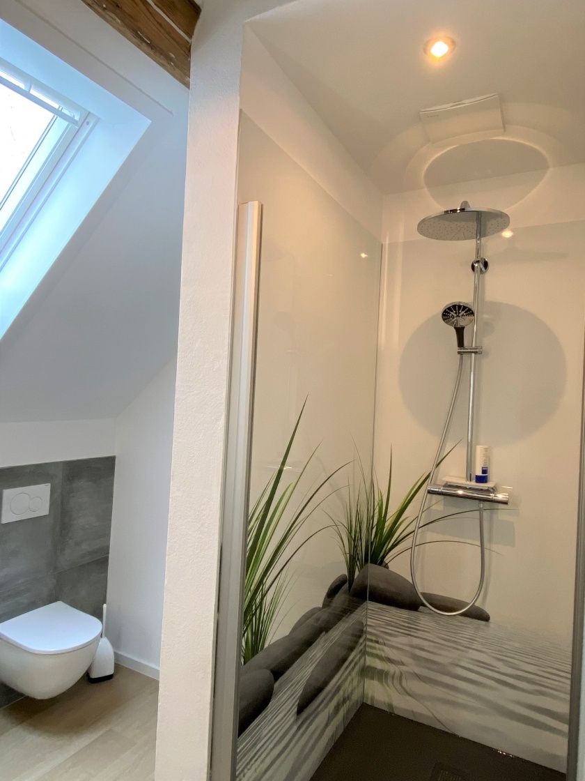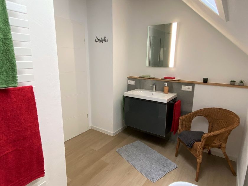- Das Duschbad verfügt über ein WC, eine große Walk-In Dusche 1,40 x 0,90 m mit Showerpipe (Thermostatarmatur, Kopfbrause und Handbrause) und einen Waschtisch mit Unterschrank der viel Stauraum bietet. Ein Haartrockner liegt für Sie bereit.