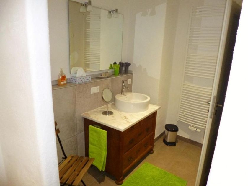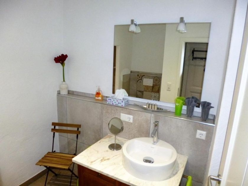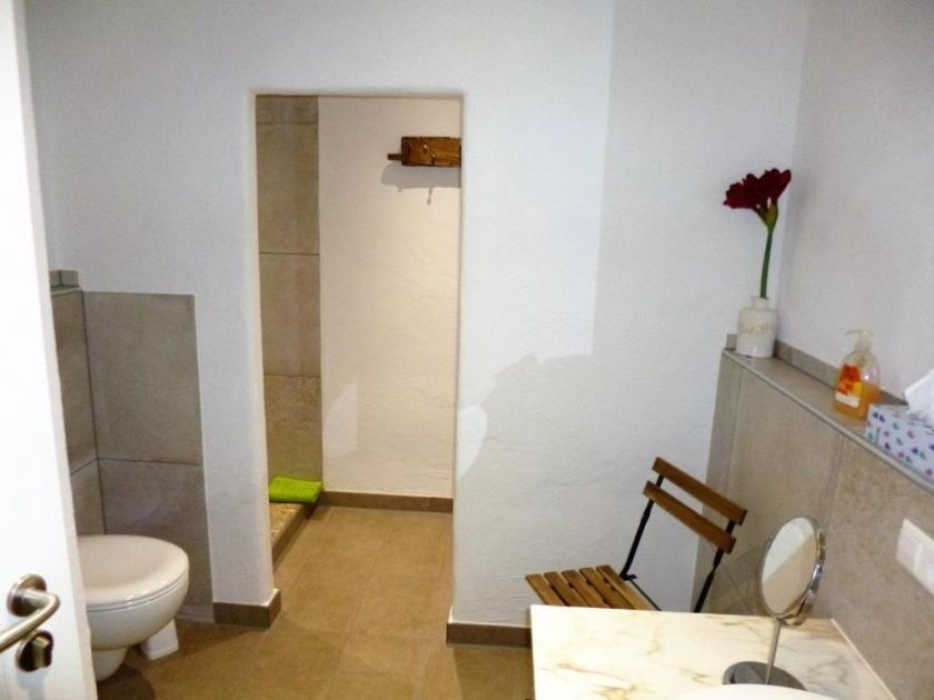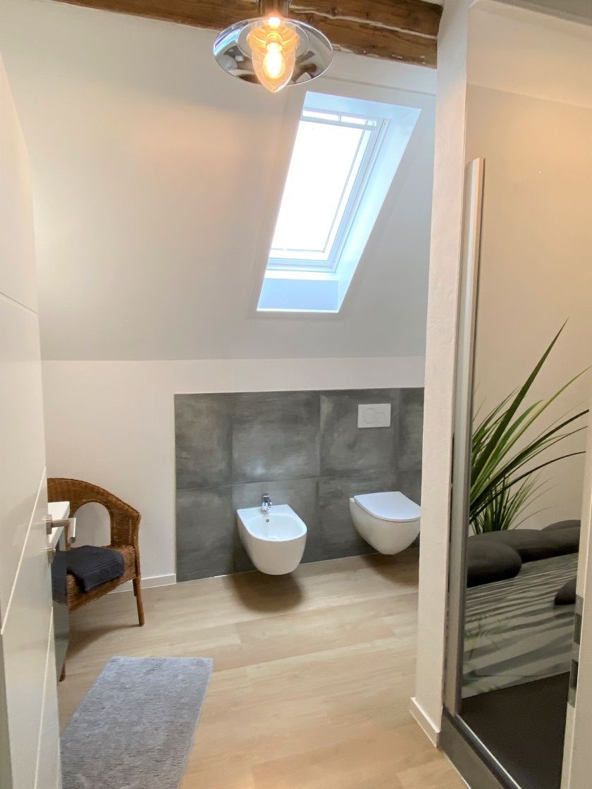 - Das Duschbad verfügt über ein WC, ein Bidet, eine große Walk-In Dusche 1,20 x 0,90 m mit Showerpipe (Thermostatarmatur, große Kopfbrause und Handbrause) und einen Waschtisch mit Unterschrank der viel Stauraum bietet. Ein Haartrockner liegt für Sie bereit.