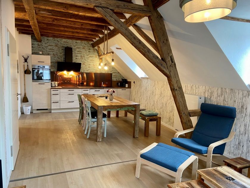 Die drei Wohnungen können auch zusammen vermietet werden, in der Ferienwohnung Wernerkapelle befindet sich genug Platz und Geschirr, dass man dort entspannt auch mit sechs Personen Kochen, Essen und gemütlich zusammen sitzen kann, in der Ferienwohnung Burgblick finden bis zu 10 Personen Platz am großen Esszimmertisch.