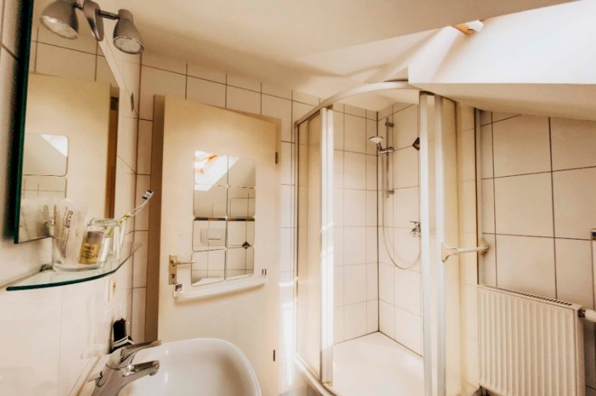 • Großes Bad mit ebenerdiger Dusche, WC und Handtuchheizkörper sowie Fön und kostenfreien Badartikeln (Seife, Shampoo, etc.). Kostenfreies WLAN, Flachbild-TV, SAT-TV, zwei Betten á 90x200 cm, Kleiderschrank, Tisch und Stuhl.