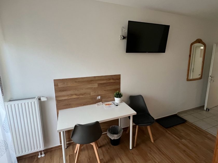 • Bad mit Dusche, WC und Handtuchheizkörper sowie Fön und kostenlose Badartikel (Seife, Shampoo, etc.). Kostenfreies WLAN, Flachbild-TV, SAT-TV, Bett 90x200 cm, Kleiderschrank, Tisch und Stuhl, Zugang zur Terrasse.