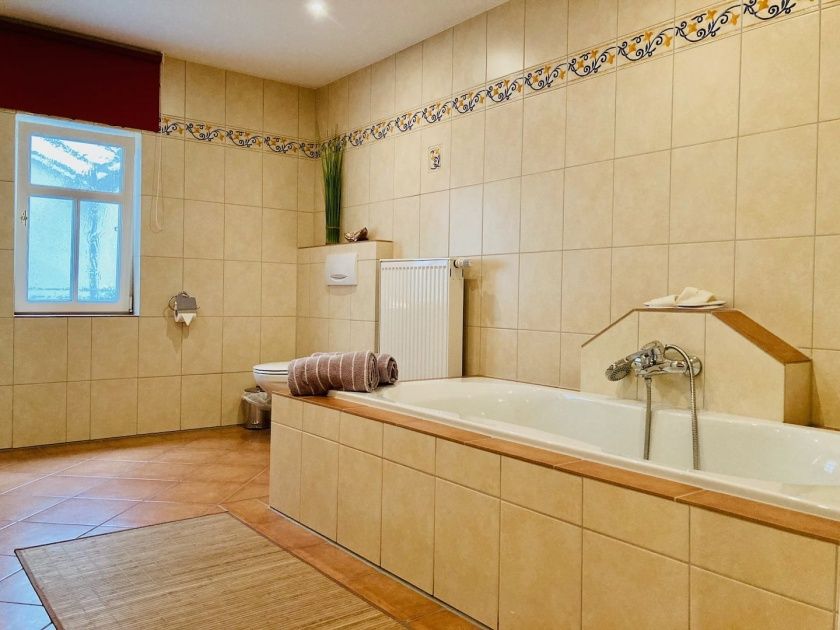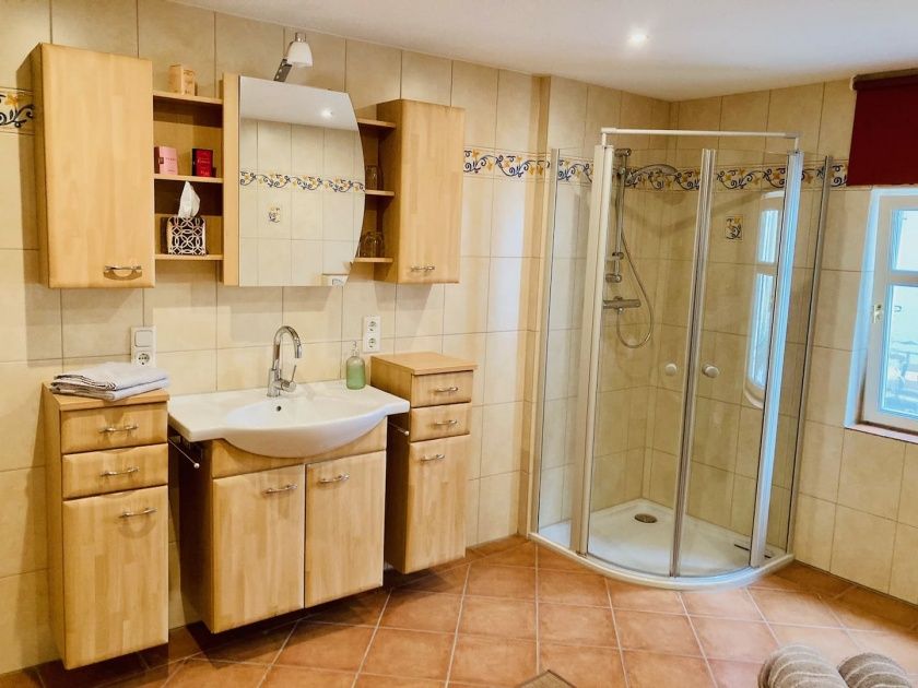 Wir haben 2 moderne Schlafzimmer mit je einem Boxspringbett im OG sowie das Bad mit Dusche und Badewanne. Im EG befindet sich die großzügige voll ausgestattete Küche, Ess- und Wohnbereich sowie noch ein Duschbad.