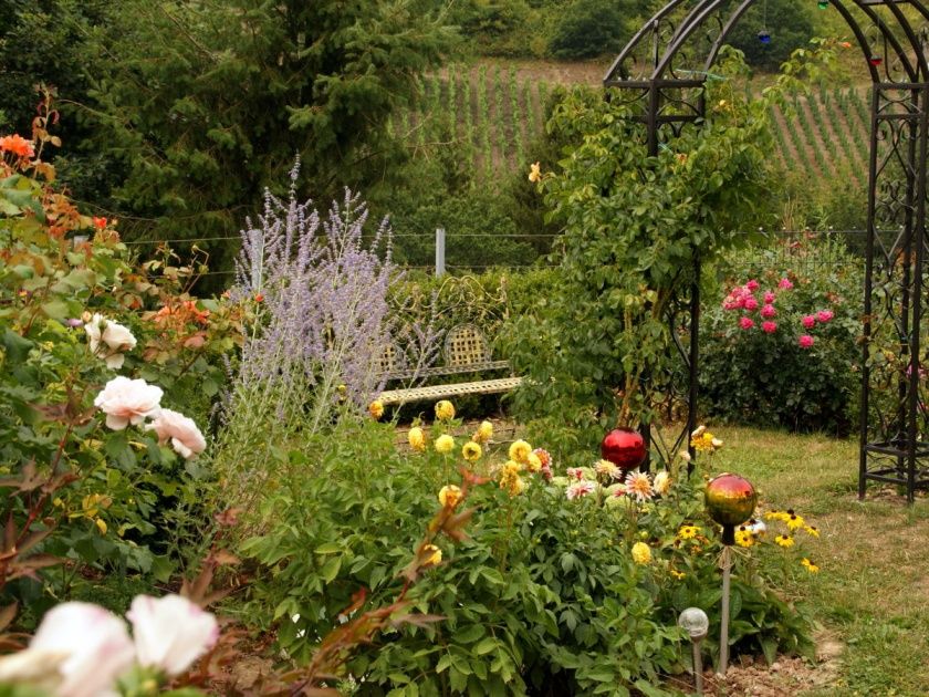 Genießen Sie die Atmosphäre unseres gepflegten, romantischen Gartens mit verschiedenen Sitzgelegenheiten.