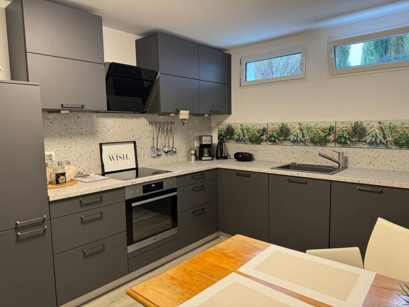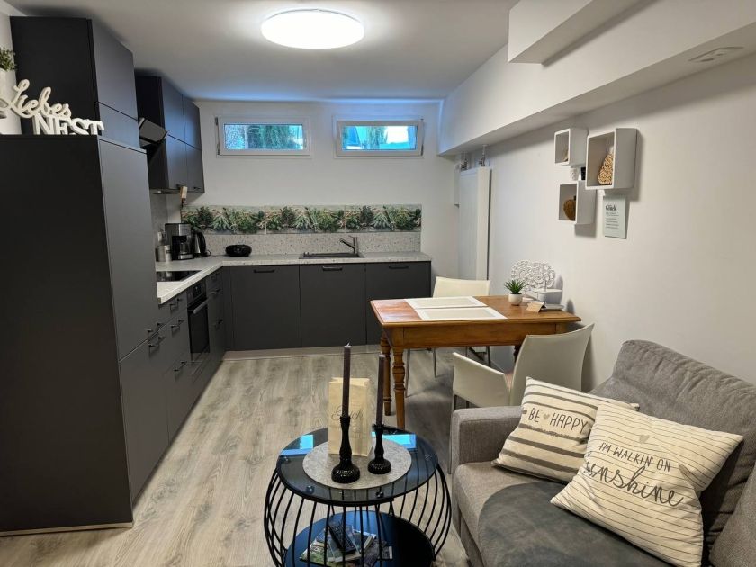 Dies ist unsere wunderschöne, schnuckelige Wohnungen im unteren Bereich. Sie ist total modern und liebevoll eingerichtet. Null Kellercharakter! Unsere Gäste lieben diese Wohnung. Natürlich dürfen die Gäste die vielen Sitzmöglichkeiten im Hof und Garten auch nutzen.
