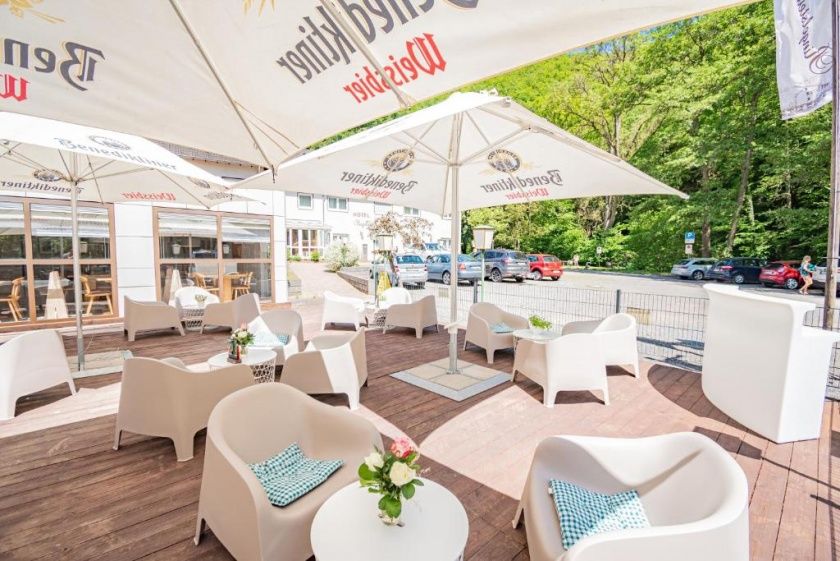 Vor dem Restaurant befindet sich eine große Sonnenterasse mit weiteren 100 Sitzplätzen! Unsere Konditorei versorgt Sie täglich mit allerlei Leckerem zum Kaffee! Eine gutbürgerliche Küche lässt (fast) keine Wünsche offen! Erlesene Weine aus unserer Gegend warten darauf Ihren Gaumen zu erfreuen! Reichlich Parkplätze für Bus und PKW stehen Ihnen direkt vor dem Haus zur Verfügung!