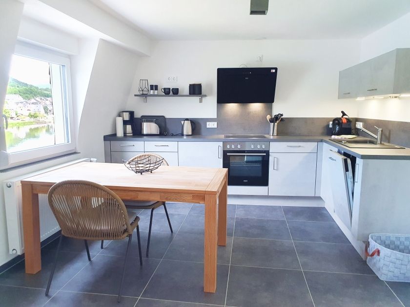 Alle bodentiefen Fenster zur Moselseite sorgen für eine lichtdurchflutete Atmosphäre. Der helle Wohnbereich lädt mit Flachbild-Sat-TV und direktem Zugang zum südwestlich ausgerichteten Balkon mit gemütlicher Rattan-Sitzgruppe zum Verweilen ein. Die moderne, voll ausgestattete Küche bietet ein Cerankochfeld, Backofen, Spülmaschine, Kaffeemaschine und Wasserkocher – es fehlt an nichts. Erholsamen Schlaf garantiert das ruhige Schlafzimmer mit Boxspring-Doppelbett (1,80m × 2m). Das luxuriöse Bad überzeugt mit einer großzügigen Glasdusche (120 × 90 cm), Handtuchheizung und Fön. Alle Fenster sind mit Rollläden ausgestattet. Zusätzlich stehen eine Waschmaschine sowie ein ebenerdiger Kellerraum mit E-Bike-Lademöglichkeit zur Verfügung. Nichtraucherwohnung, keine Haustiere erlaubt.