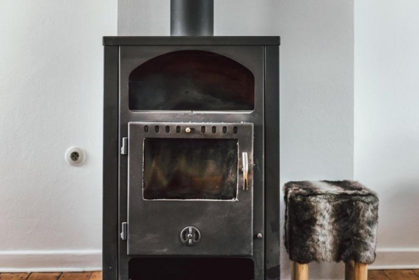 - Großer Wohnbereich mit Sofa, Sitzecke, Holzofen und TV.
