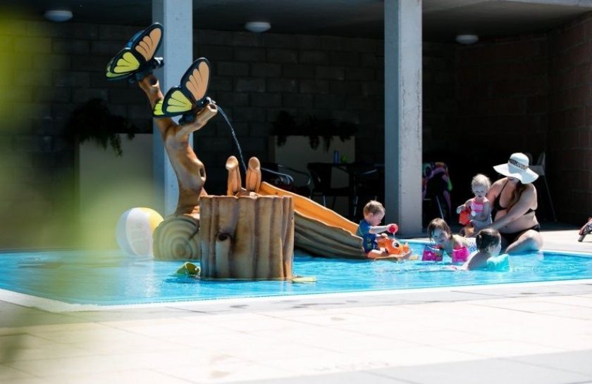 Das große Becken hat einen tieferen Teil mit einer kleinen Rutsche und einen flachen Teil mit einer kleinen Rutsche und einem wasserspritzenden Elefanten. Für die Kleinsten gibt es ein separates Kleinkinderbecken mit einer weiteren Kleinkinderrutsche in der Mitte.