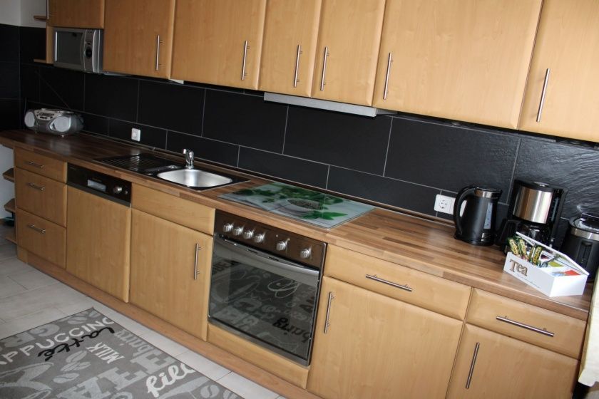 • Die voll ausgestattete Einbauküche befindet sich ebenso wie der Wohnbereich im unteren Stock. Die Wohnung ist nicht barrierefrei, da die beiden Stockwerke nur über Treppen erreichbar sind.