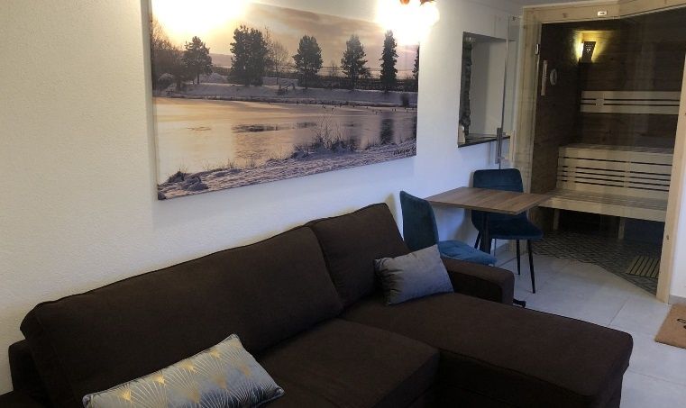 Die Wellnessoase kombiniert Sauna und Infrarotkabine, innerhalb der Wandverkleidung aus massivem Fichtenholz heizt ein originaler finnischer Saunaofen den Raum auf. Nach dem Aufenthalt stehen Duschen in direkter Nähe bereit. In den 14m² finden 4 Personen angenehm Platz.