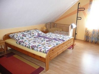 - Schlafzimmer mit Doppelbett sowie Baby-Bett und Wickelkommode.