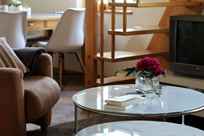 Diese, im Obergeschoss gelegene Wohlfühlwohnung auf einer Ebene, ist für zwei Personen mit Kleinkind bestens geeignet und verfügt über ein großzügiges, mit restaurierten Möbeln ausgestattetes Schlafzimmer (für Allergiker geeignet), ein exklusives Bad mit Badewanne, Dusche und WC, einer hellen, freundlichen Küche mit Leseecke und Relaxsessel und einem gemütlichen Wohnzimmer. Historische Architekturelemente bieten auch hier einen besonderen Charme.