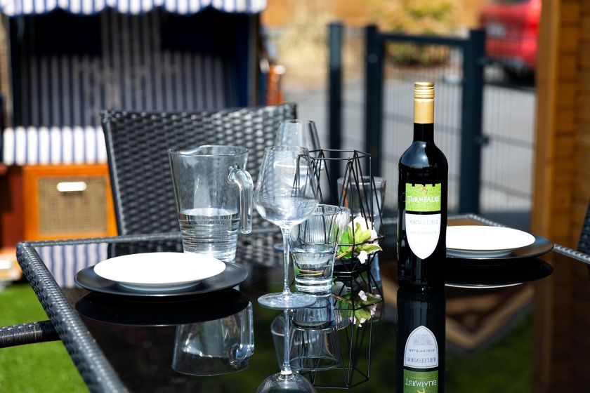 - Terrassenmöbel und Liegestühle mit Strandkorb und Holzkohlegrill