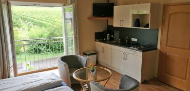 Das Appartement “Weinberg” (ca. 26 qm), mit einer voll ausgestattete Küchenzeile, modernen Bad mit Dusche und einem Schlafsofa ausgestattet, liegt im 1. Obergeschoss und bietet einen Blick in die Weinberge. Die Terrasse ist mit einem kleinen Gang ums Haus erreichbar.