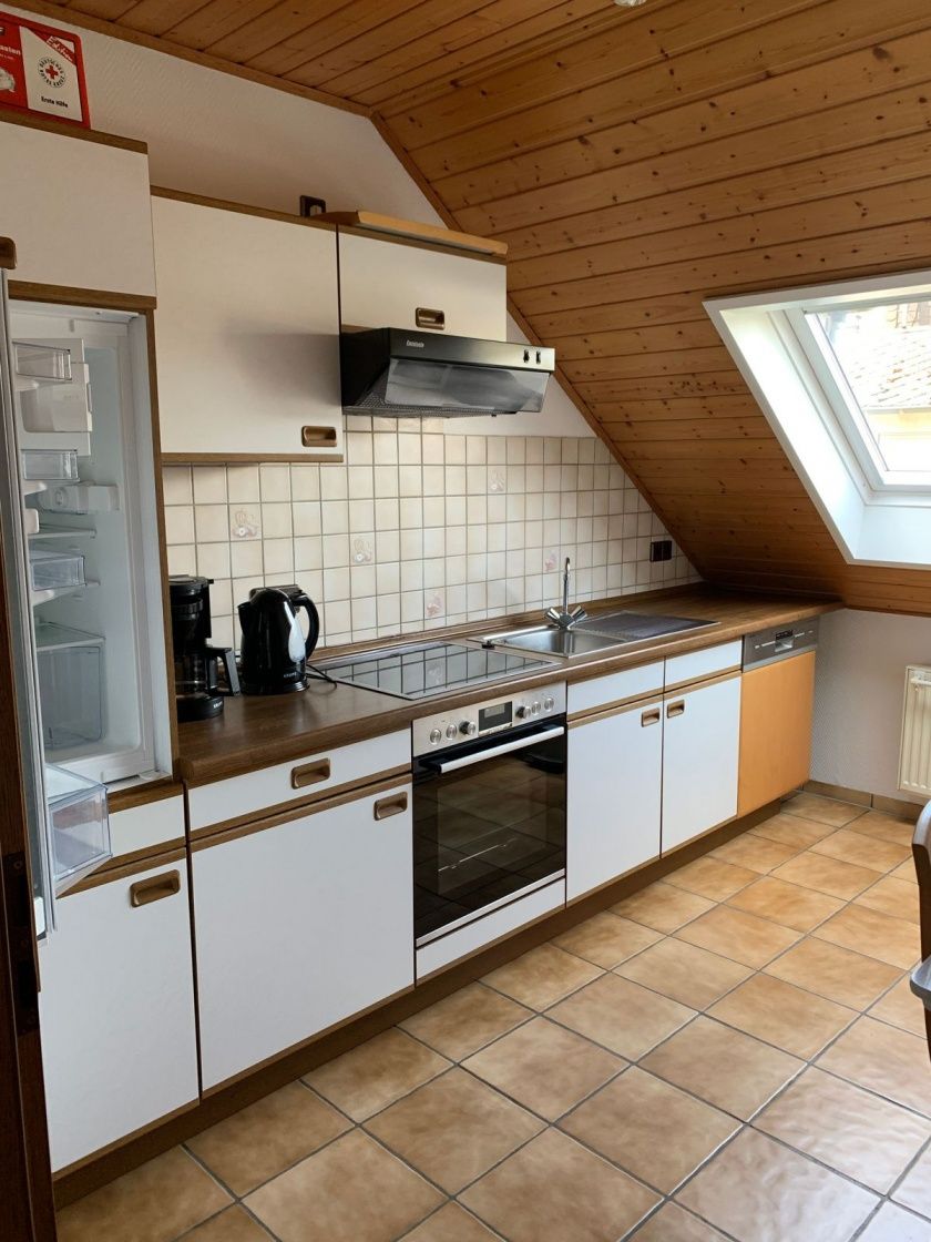 - 1 Wohnraum mit moderner Einbauküchenzeile, die Küche ist mit Spülmaschine, Mikrowelle, Toaster, Wasserkocher, Kaffee- und Senseomaschine ausgestattet.