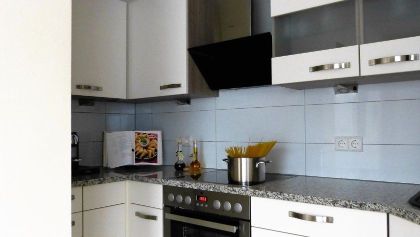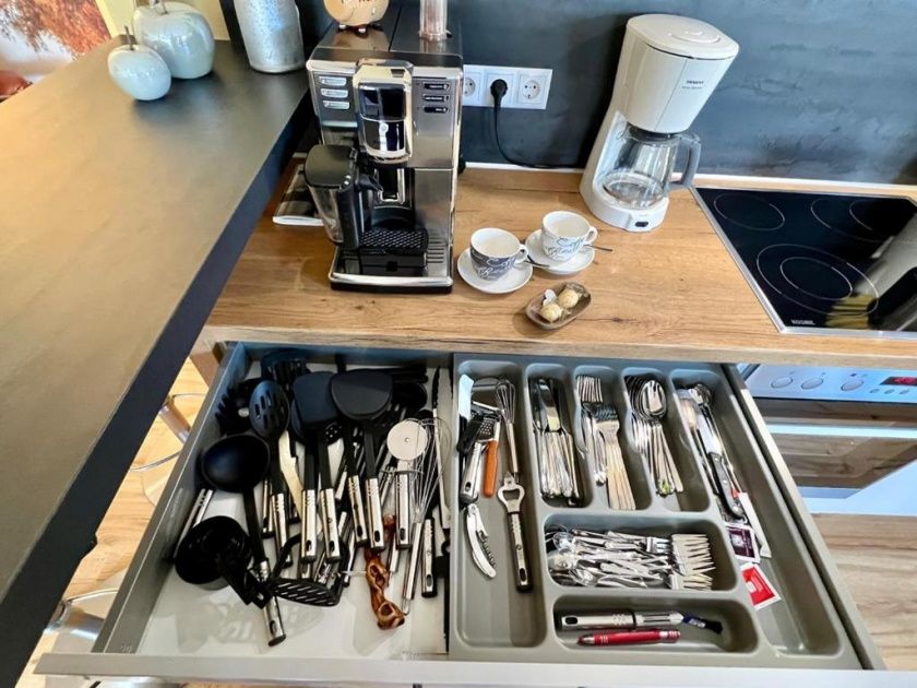 - Die moderne Einbauküche mit Theke und Barhockern, ist wie Zuhause komplett mit Marken-Einbaugeräten, Kleingeräten und stilvollem Geschirr eingerichtet. Es steht eine Filterkaffeemaschine und ein hochwertiger Kaffeevollautomat bereit. Wählen Sie selbst wie Sie ihren Kaffee zubereiten möchten.