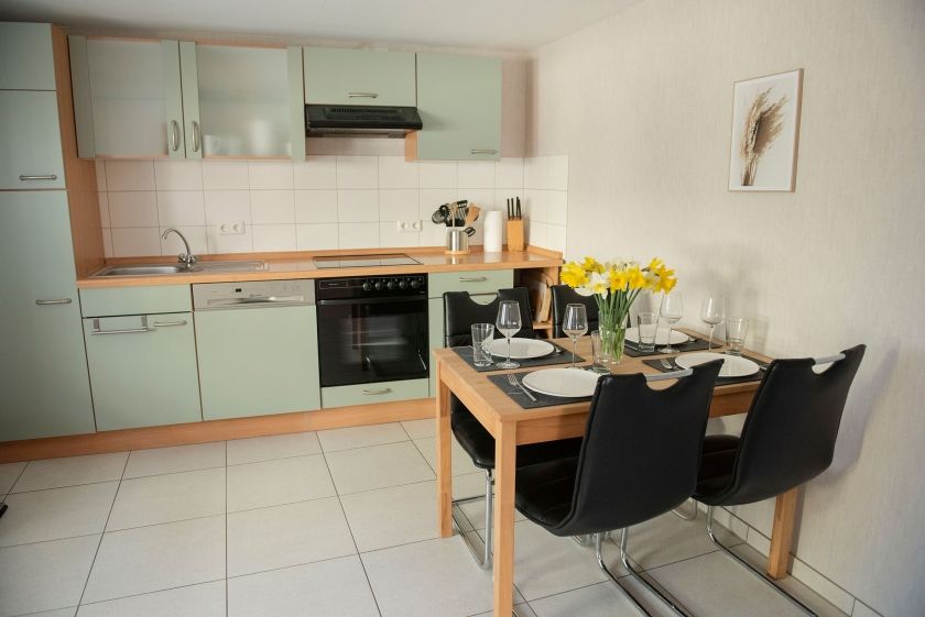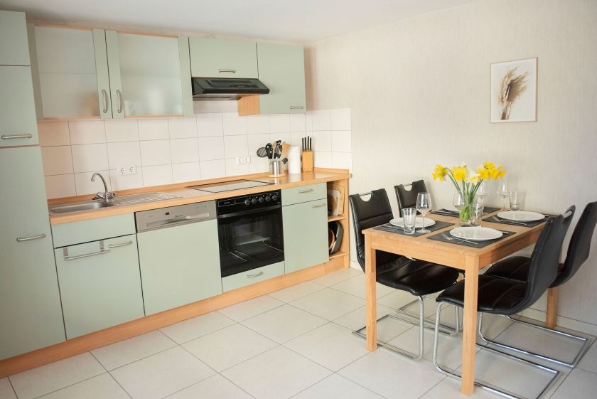 - Küche, komplett ausgestattet mit Herd, Backofen, Spülmaschine, Mikrowelle, Kühlschrank und Wasserkocher