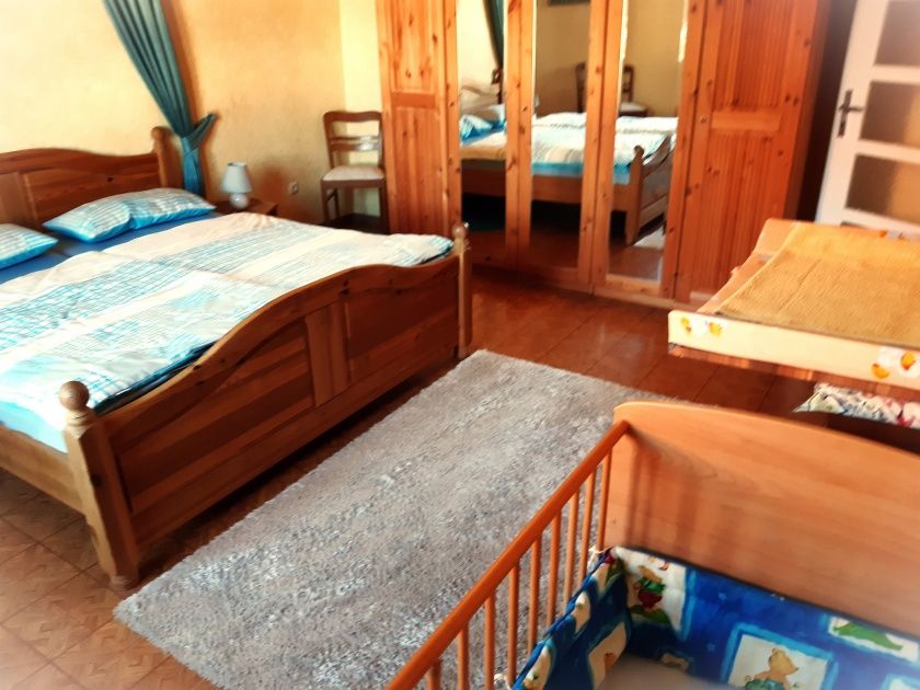 - Schlafzimmer "Bruder Konrad" mit Doppelbett, Kinderbett, Wickelkommode, Windeleimer